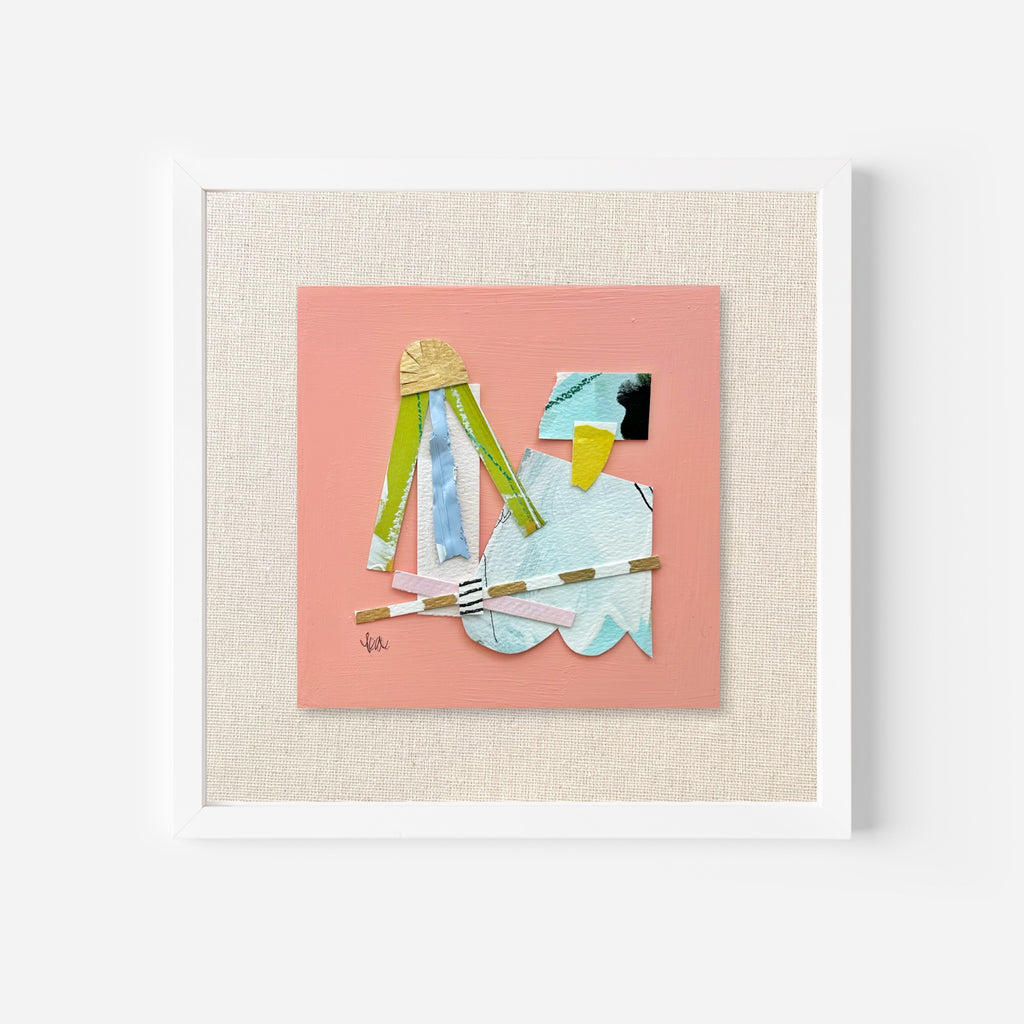 10x10 white shadow box with 6" mixed media collage artwork on wood, float mounted to a linen panel. Shipping or local delivery included.