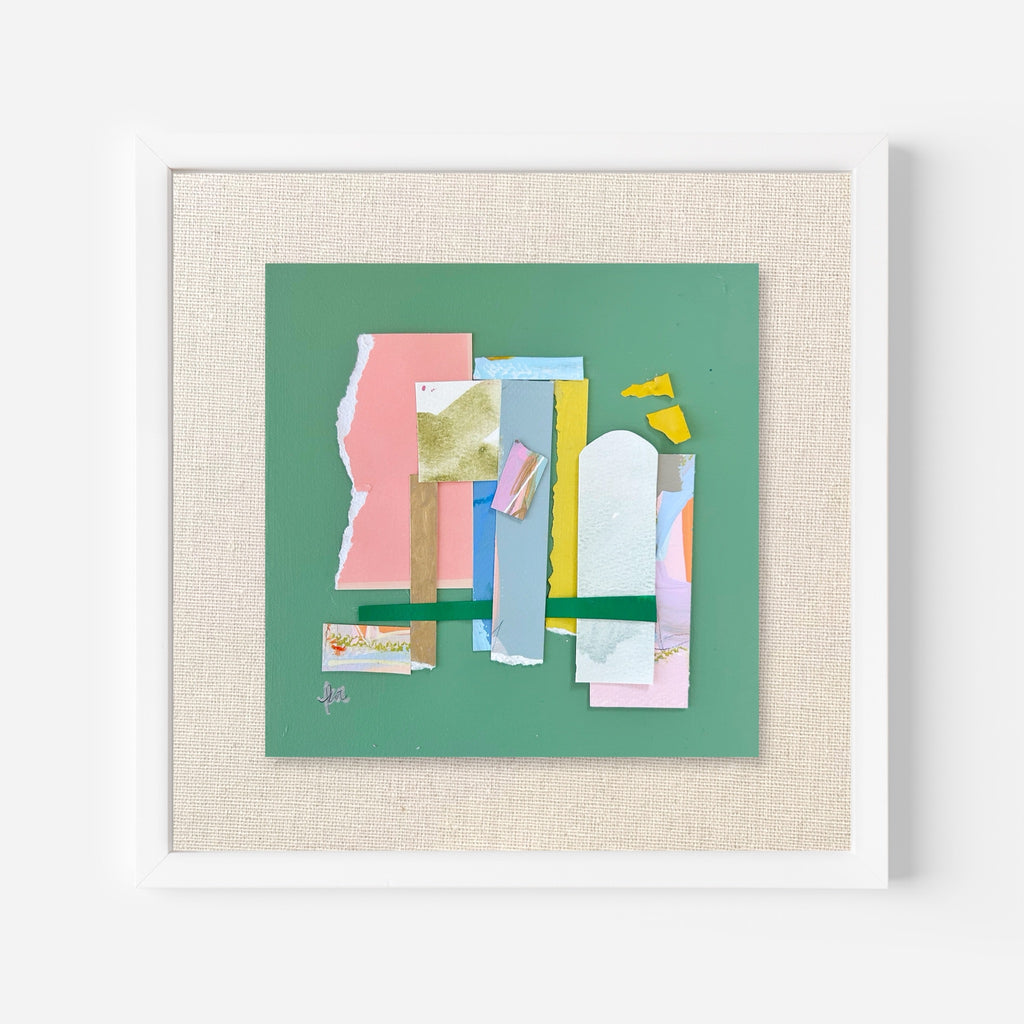 12x12 white shadow box with 8" mixed media collage artwork on wood, float mounted to a linen panel. Shipping or local delivery included.