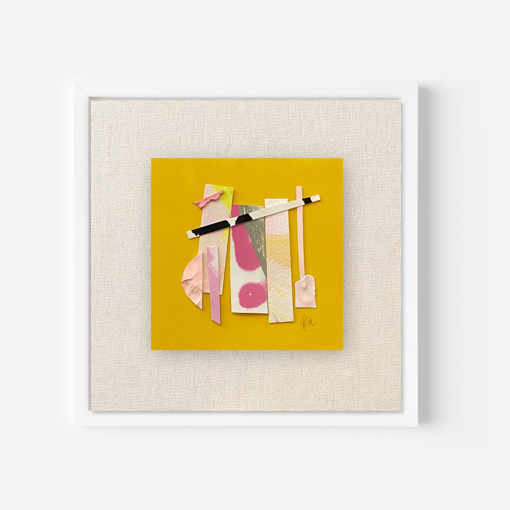 10x10 white shadow box with 5" mixed media collage artwork float mounted to a linen panel. Shipping or local delivery included.