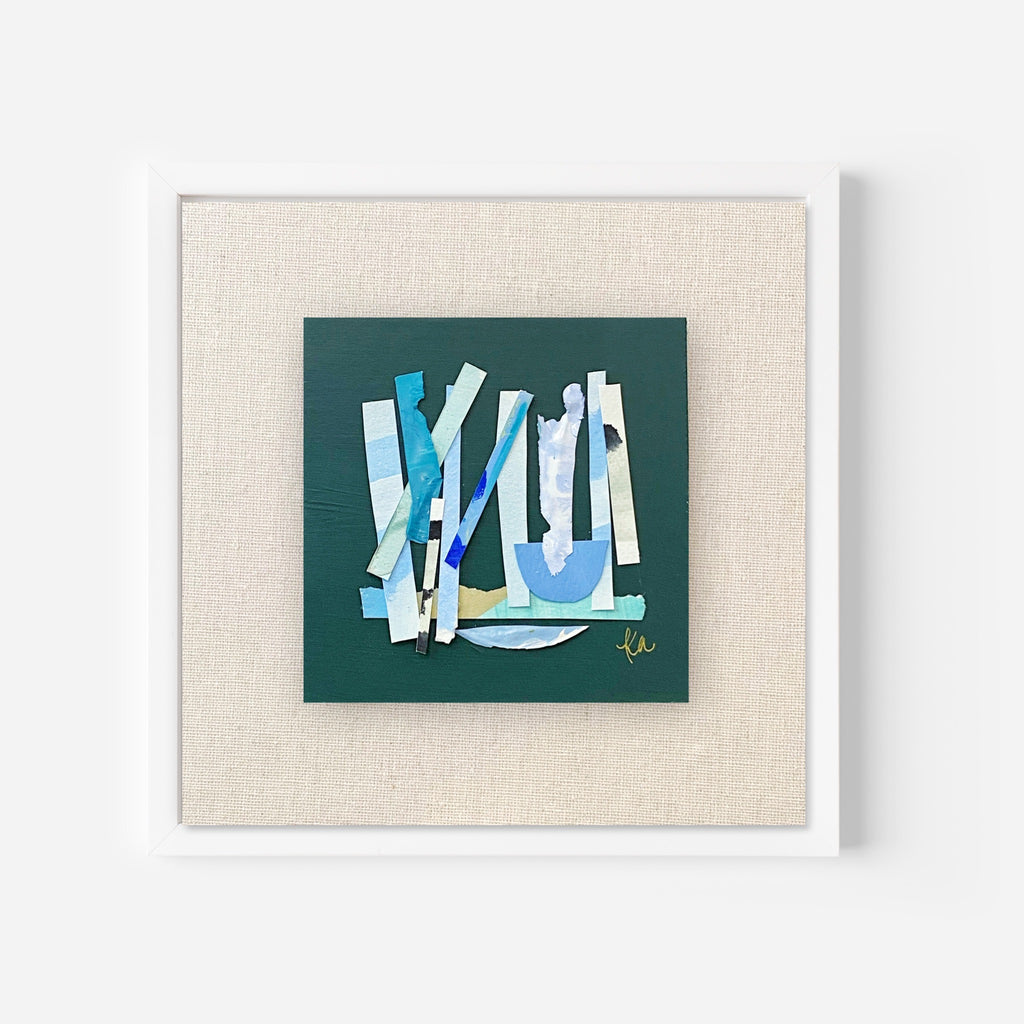 10x10 white shadow box with 5" mixed media collage artwork float mounted to a linen panel. Shipping or local delivery included.