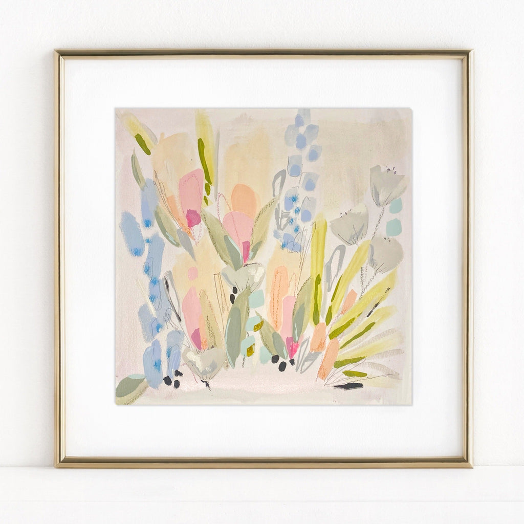 12” x 12” original artwork on fine art paper. Mixed media including acrylic, ink, oil pastel, & gold leaf. Framed in 16” gold aluminum & glass frame with 2” white mat. Hanging hardware is installed.
