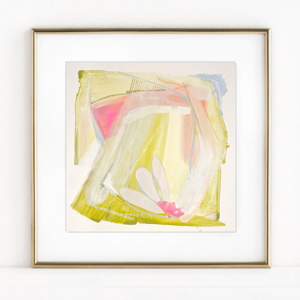 12” x 12” original artwork on fine art paper. Mixed media including acrylic, ink, oil pastel, & gold leaf. Framed in 16” gold aluminum & glass frame with 2” white mat. Hanging hardware is installed.