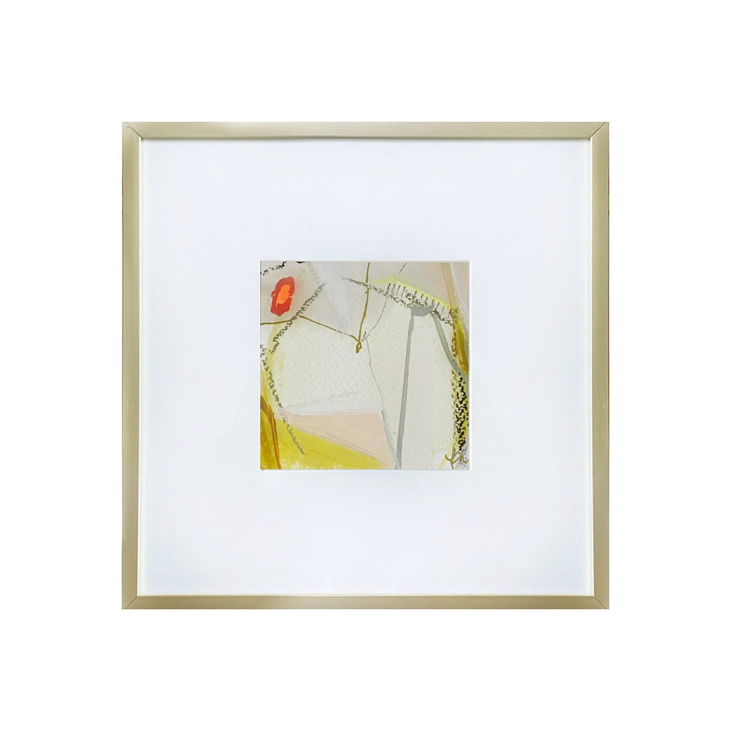 4” x 4” original artwork on fine art paper. Mixed media including acrylic, ink, oil pastel, & gold leaf. Framed in 8” x 8” gold aluminum & glass frame with white mat. Hanging hardware is installed.