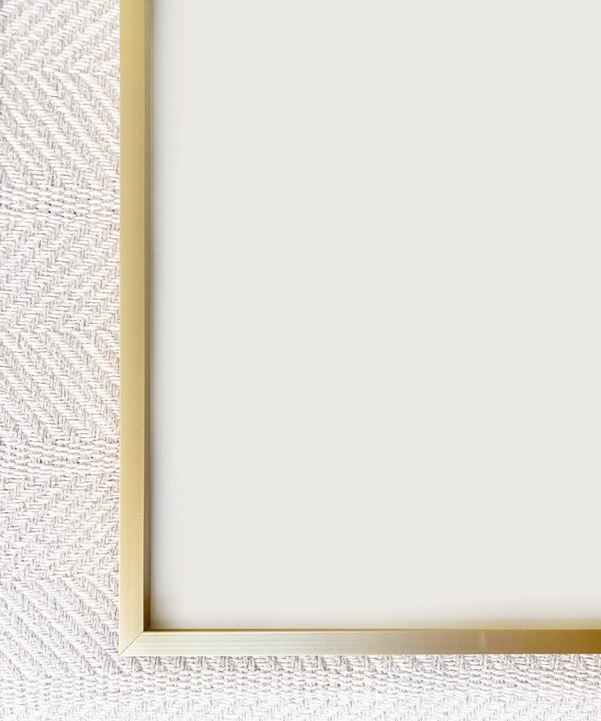 *note: framing depicted is digitally imposed, therefore it is a representation of the frame included, but not exact. See the last photo for actual frame, a thin brushed aluminum in a pale gold shade.