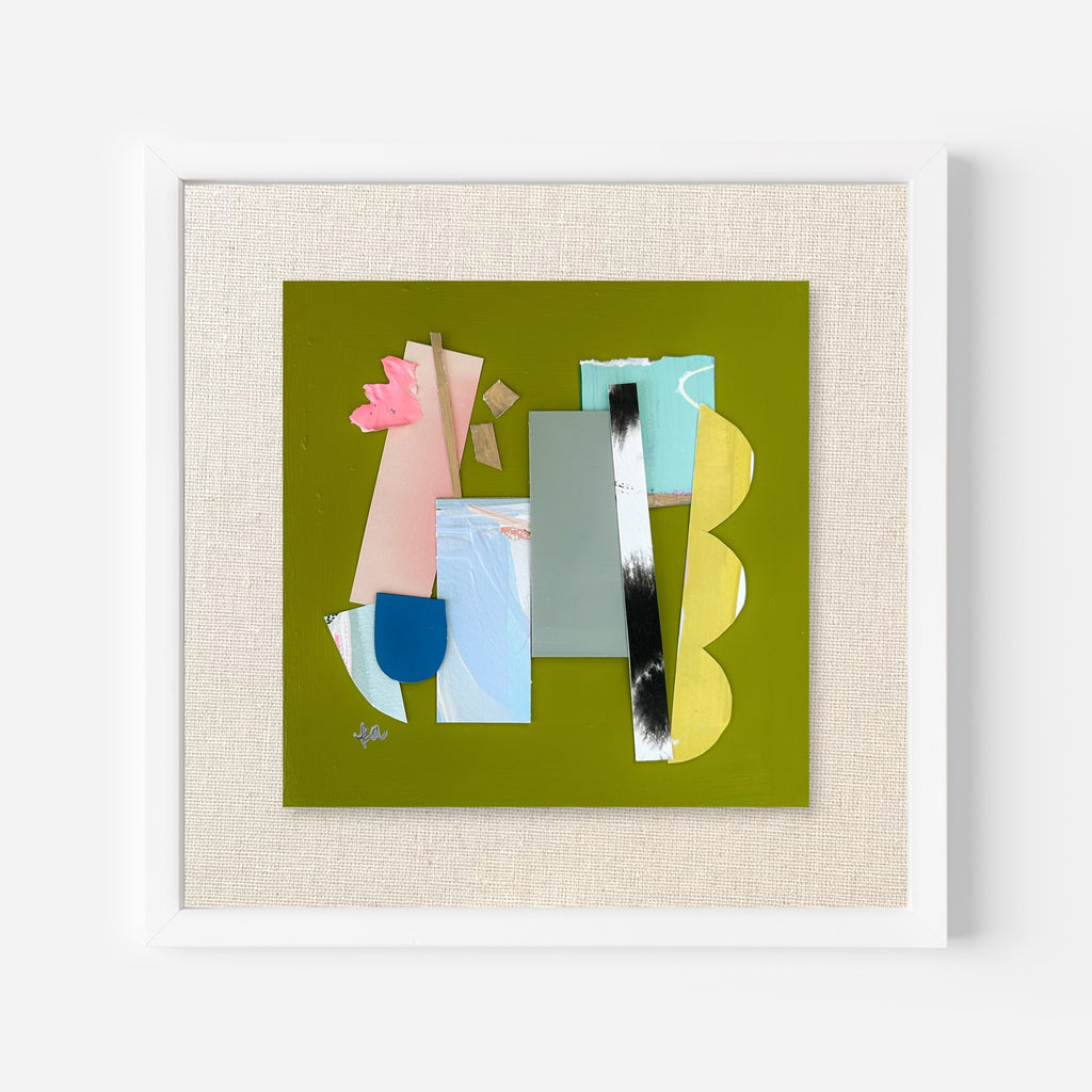 12x12 white shadow box with 8" mixed media collage artwork on wood, float mounted to a linen panel. Shipping or local delivery included.