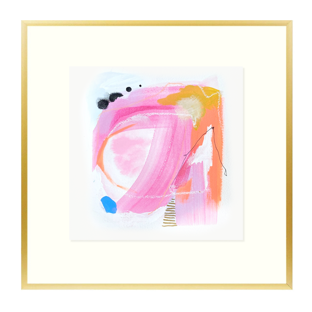 8”x 8” original artwork on fine art paper. Mixed media including acrylic, ink, oil pastel, & gold leaf. Framed in 12” x 12” gold aluminum & glass frame with an offset white mat. Hanging hardware is installed.