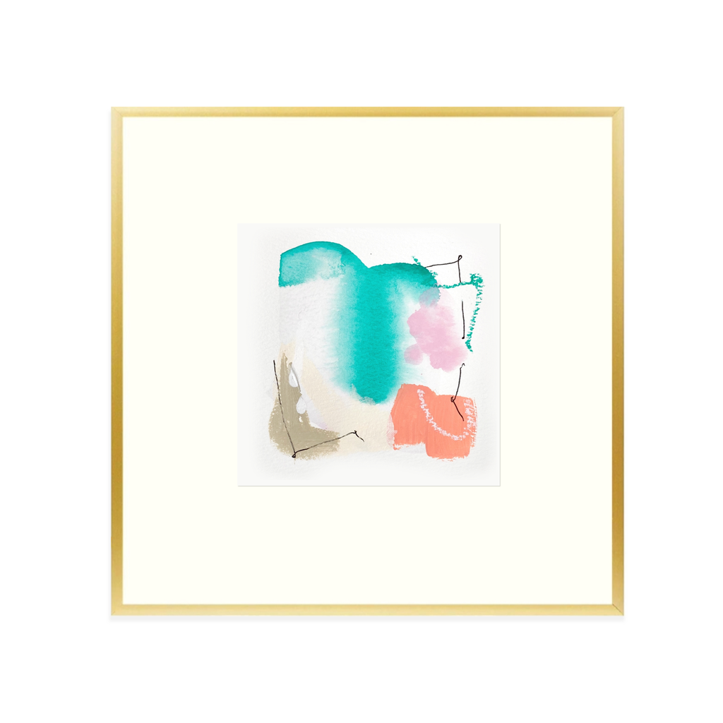 4” x 4” original artwork on fine art paper. Mixed media including acrylic, ink, oil pastel, & gold leaf. Framed in 8” x 8” gold aluminum & glass frame with an offset white mat. Hanging hardware is installed.
