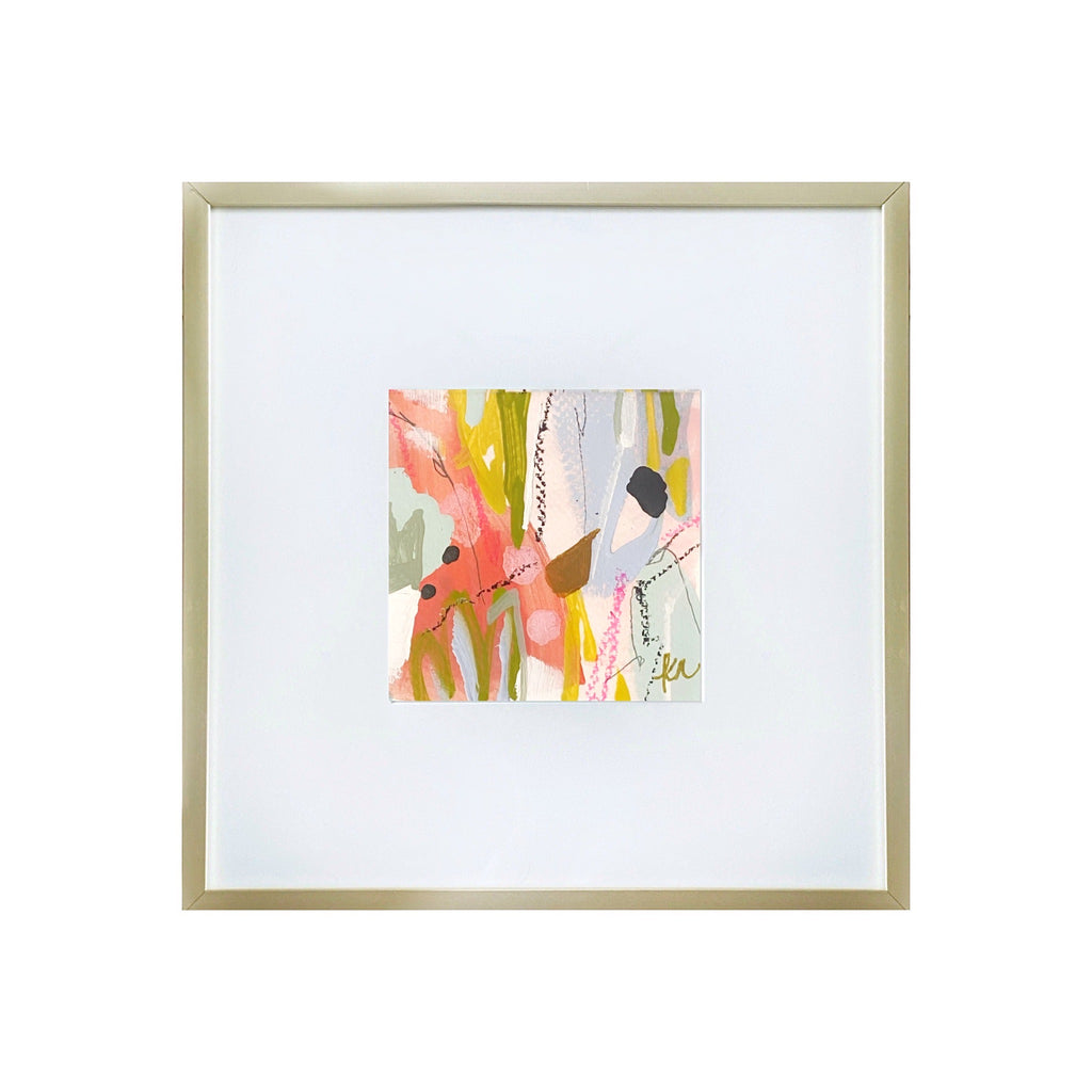 4” x 4” original artwork on fine art paper. Mixed media including acrylic, ink, oil pastel, & gold leaf. Framed in 8” x 8” gold aluminum & glass frame with white mat. Hanging hardware is installed.